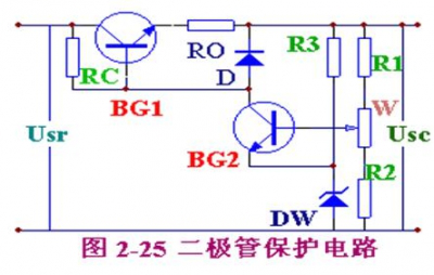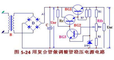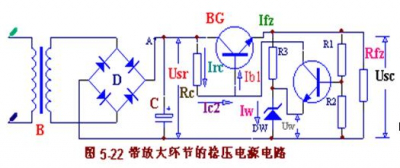 圖中,BG1 是調(diào)整管,BG2 是比較放大管。輸出電田變化量△Usc 的一部分與基準(zhǔn)電壓Uw 比較,并經(jīng)BG2 放大后進(jìn)到了BG1 的基極。Rc 是BG2 的集電極電阻,又是BG1 的上偏置電阻。R1、R2是BG2 的上、下偏置電阻,組成分壓電路,把ΔUsc 的一部分作為輸出電壓的取樣,送給BG2 的基極,因此又叫