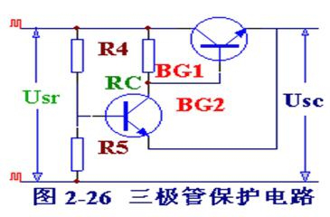圖2-26是三極管保護(hù)電路。由三極管BG2和分壓電阻R4、R5組成。電路正常工作時(shí),通過(guò)R4與R5的壓作用,使得BG2的基極電位比發(fā)射極電位高,發(fā)射結(jié)承受反向電壓。于是BG2處于截止?fàn)顟B(tài)(相當(dāng)于開(kāi)路),對(duì)穩(wěn)壓電路沒(méi)有影響。當(dāng)電路短路時(shí),輸出電壓為零,BG2的發(fā)射極相當(dāng)于接地,則BG2處于飽和導(dǎo)通狀態(tài)(相當(dāng)于短路),從而使調(diào)整管BG1基極和發(fā)射極近于短路,而處于截止?fàn)顟B(tài),切斷電路電流,從而達(dá)到保護(hù)目的。